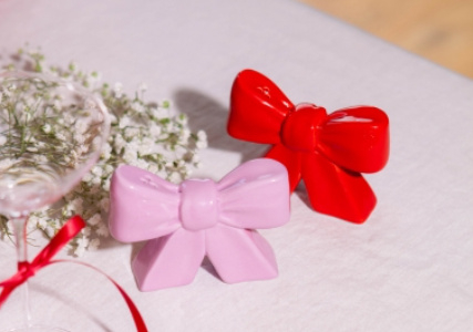 Kleur en vrolijkheid op de eettafel met dit knetterleuke zout- en peperstel in strikvorm met zachte roze en helderrode tinten.