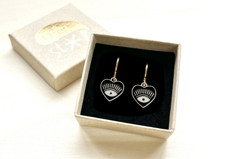 Oorbellen van het Nederlandse merk Illu-ster. Een beetje mysterieus maar ook heel olijk, deze oorhangers in de vorm van een hartje met oogjes die alles zien op een zwarte achtergrond. Je krijgt de oorbellen op een kussentje in een mooi doosje van graspapier met een goudfolie opdruk. Zo zijn de oorbellen een superleuk cadeau voor jezelf of een ander.