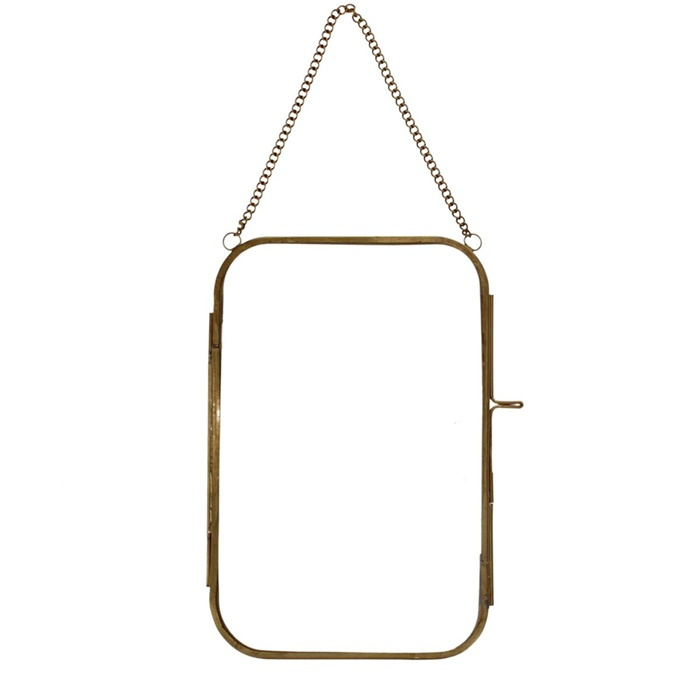 Hang je favoriete foto, droogbloem of b.v. tekening op in dit mooie messing frame. Je kan de foto plaatsen tussen twee glasplaatjes, deze worden bij elkaar gehouden door een messing frame met een vintage look. Aan het frame een kettinkje om deze mee aan een spijker of haakje te hangen.