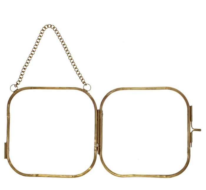Hang je favoriete foto, droogbloem of b.v. tekening op in dit mooie messing frame. Je kan de foto plaatsen tussen twee glasplaatjes, deze worden bij elkaar gehouden door een messing frame met een vintage look. Aan het frame een kettinkje om deze mee aan een spijker of haakje te hangen.