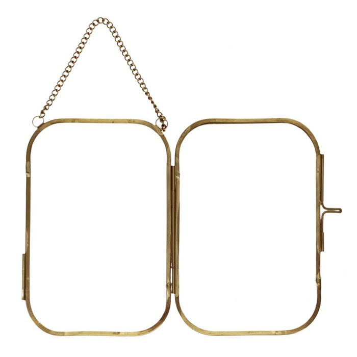 Hang je favoriete foto, droogbloem of b.v. tekening op in dit mooie messing frame. Je kan de foto plaatsen tussen twee glasplaatjes, deze worden bij elkaar gehouden door een messing frame met een vintage look. Aan het frame een kettinkje om deze mee aan een spijker of haakje te hangen.